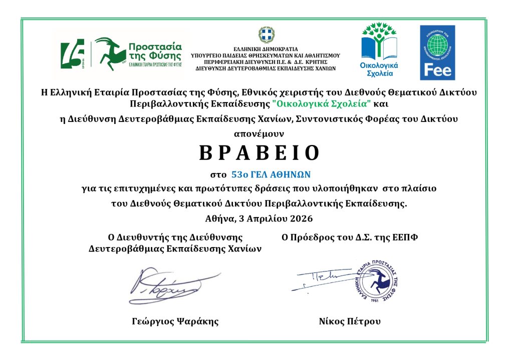 Το 53ο ΓΕΛ Αθηνών είναι και επίσημα βραβευμένο σχολείο με 3 "Πράσινες Σημαίες Οικολογικών Σχολείων- FEE Eco-Schools Green Flag Award"! Η μεγάλη αυτή διάκριση, δηλαδή η βράβευση με την 3η "Πράσινη Σημαία", έγινε στο 1ο Μαθητικό Φεστιβάλ Οικολογικών Σχολείων στην Τεχνόπολη στις 3 Απριλίου 2026. Το φεστιβάλ τέλεσε υπό την αιγίδα της Α.Ε. του Προέδρου της Ελληνικής Δημοκρατίας.