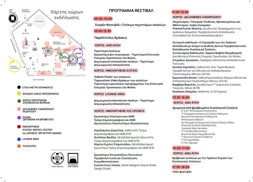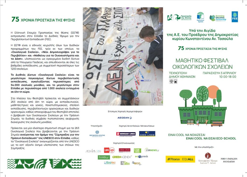 Με αυτό το μήνυμα σας προσκαλούμε με χαρά να παραλάβετε το βραβείο σας, την Πράσινη Σημαία των Οικολογικών Σχολείων, στο 1ο Μαθητικό Φεστιβάλ Οικολογικών Σχολείων που πρόκειται να πραγματοποιηθεί στην Τεχνόπολη του Δήμου Αθηναίων, την Παρασκευή 3 Απριλίου 2026 και ώρα 10.00 με 18.00.”